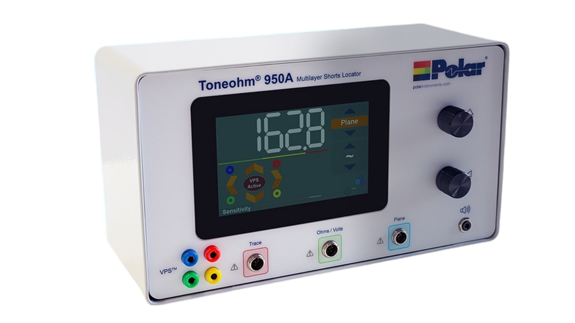 The Toneohm 950A is a powerful multilayer shorts locator designed to quickly and accurately pinpoint PCB faults, helping manufacturers, assemblers, and field engineers minimize scrap, reduce rework costs, and boost productivity. Using Polar’s innovative Vector Plane Stimulus (VPS™) technology, it provides a simple, non-destructive way to trace shorts between power and ground planes, tracks, or components—even on complex multilayer and surface-mount boards. Ideal for both bare and loaded PCBs, the 950A makes short location faster, easier, and more reliable, ensuring higher efficiency and cost savings in electronics production and service.